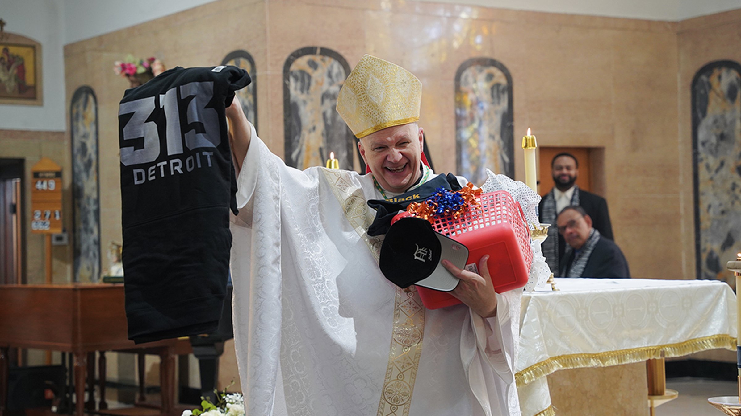 Parishioners also offered Archbishop Weisenburger a basket of Detroit-themed gifts, including a Detroit Tigers baseball cap and apparel displaying Detroit’s “313” area code.