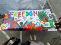 Breanna Jackson, a local artist with AADM, led a public art session: “Painting Freedom.” Sketching out the word “freedom” on a banner, Jackson allowed people of all ages and skill levels to color and add their personal touch to the community mural.