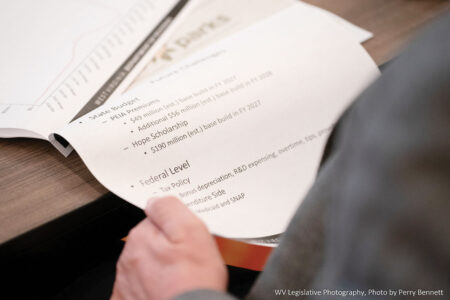 - A lawmaker flips through a presentation Monday by the state Department of Commerce looking at future increased strains on the general revenue budget. (Photo courtesy of WV Legislative Photography)