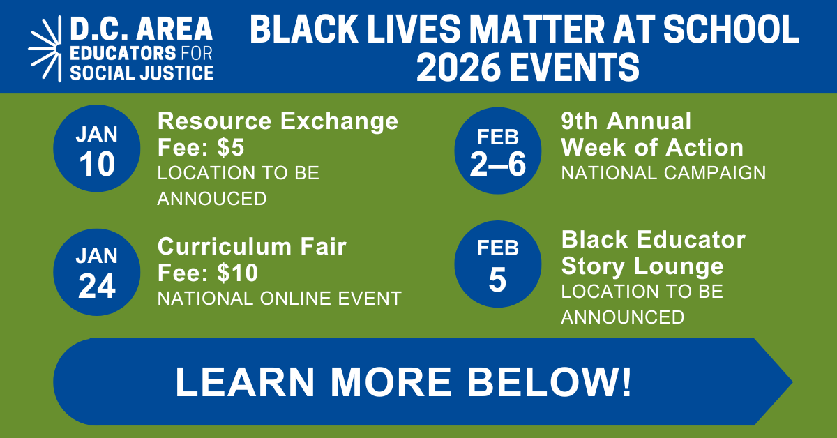 From February 2–6, 2026, Teaching for Change’s D.C. Area Educators for Social Justice, D.C. area educators, and community members will collaborate on the ninth annual D.C. Area Black Lives Matter at School Week of Action. This local week of action built on the momentum of past years’ successful weeks of action and the National Black Lives Matter at School Year of Purpose campaign in cities across the U.S. to promote a set of national demands based in the Black Lives Matter guiding principles that focus on liberation and racial justice in education for Black youth, educators, and all youth of color. Learn more.