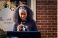 Channing Hughston, a second-year studying psychology and the 2025-26 Membership and Outreach Chair for Penn State’s Student Black Caucus, speaks at an event.
