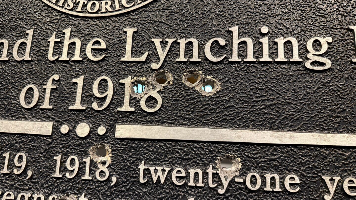 Closeup showing bullet holes in a Georgia Historic Marker memorializing the 1918 lynching of Mary Turner, now on display at the National Center for Civil and Human Rights, on Dec. 6, 2025 in Atlanta. (AP Photo/Michael Warren)