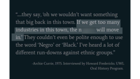 “Lillian Davenport did. She was a member of the NAACP, and she took this matter up with the state NAACP, and took it up also with the rulers—the decision makers that be—and those signs came down,” Moss continued.