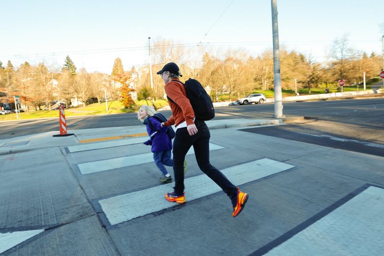Finally, a walk signal. Zivarts, who wrote the book “When Driving is Not an Option,” and Kaspars begin the long march across wide Rainier Avenue South. They’re halfway across, and drivers coming off I-90 aren’t yielding. Mercifully, one finally lets them get to the sidewalk, where Zivarts pushes another walk button.