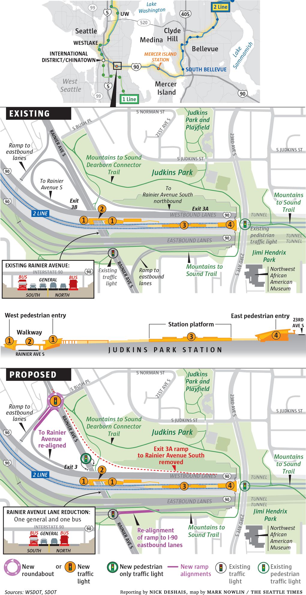 Judkins Park really is a tale of two stations. It can be either the worst light rail station to reach, or the best. At the upper-level entrance, on 23rd Avenue South, passengers disembark just steps from two parks, a museum and a network of bike paths. Below, on Rainier, in the shadow of the flying freeway — the growling I-90 — pavement abounds and platoons of cars move by threateningly, or idle noisily.