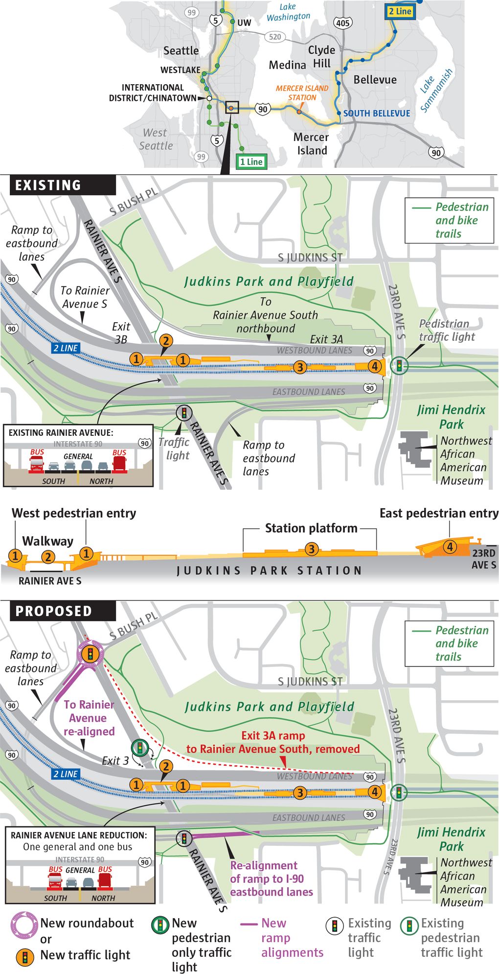 In 2016, Sound Transit estimated that 3,000 people would board the train at Judkins by 2030, 45% by foot or bike and 42% by bus.